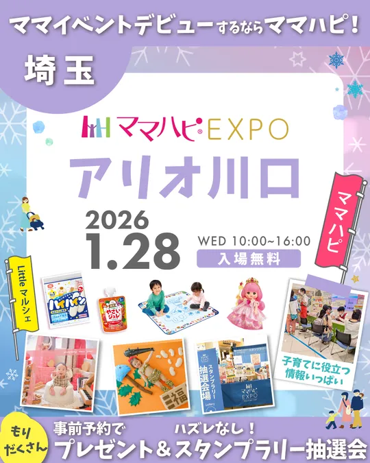2026年1月28日に、埼玉県川口市のアリオ川口で開催された「ママハピEXPO」に行ってきました。子育て中のママ・パパに向けたイベントということで、以前から気になっており、今回初めて参加することができました。