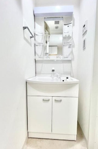洗面所独立タイプで、シャワー付き洗面化粧台を採用しております。朝の支度や帰宅後の手洗いがスムーズに行え、生活導線が快適です。収納スペースもあり、化粧品や洗面用具を整理しやすい点もポイントです。