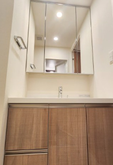 独立洗面台は、朝の身支度や帰宅後の手洗いにも便利な仕様です。大きめのミラーと収納付きキャビネットがあり、化粧品や日用品をすっきり整理できます。洗面ボウルは広めで、水はねしにくく掃除も簡単です。照明がしっかりと配置されており、明るく清潔感のある空間です。バスルームと分かれているため、同居人が入浴中でも同時に使用できるのが嬉しいポイントです。忙しい朝にもストレスなく準備ができます。ホテルライクなデザインで、生活感を抑えた上質な洗面スペースが魅力です。