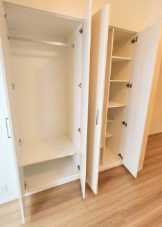 洋室には大容量のクローゼットを備えており、衣類や小物をすっきり整理できます。奥行きも十分で、季節物のコートやスーツケースなどの収納にも便利です。ハンガーパイプ付きで洋服をシワなく保管でき、上部には棚が設けられているため、バッグや寝具類の収納にも対応しています。扉付きのクローゼットは見た目もスッキリとしており、部屋全体を広く感じさせるデザインです。「見せない収納」で、生活感を抑えたスタイリッシュな空間づくりをサポートします。日々の整理整頓がしやすく、快適な居住環境を実現します。
