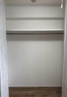 洋室に設置されたクローゼットは、収納力に優れた造りです。高さと奥行きがあり、ロングコートや季節物の衣類も余裕をもって収納できます。中には棚板も設けられており、バッグや小物類も整理しやすく、すっきりとした空間を保てます。ドア付きのため見た目もスマートで、生活感を感じないです。また、収納内部の明るい色調が清潔感を演出し、カビ防止にも効果的です。クローゼットが十分にあることで、居住スペースを最大限に活用でき、部屋全体が広く見える効果もあります。整理整頓がしやすい設計で、ミニマルな暮らしをしたい方にもおすすめです。