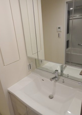 独立洗面台は、朝の身支度や帰宅後の手洗いに便利な仕様です。洗面ボウル周りには収納スペースが確保され、化粧品や洗面用具をすっきり整理できます。洗面所が独立していることで、生活動線がスムーズになり、来客時にもプライベート空間を保ちやすい点が魅力です。室内洗濯機置場も近く、家事効率を高めてくれます。