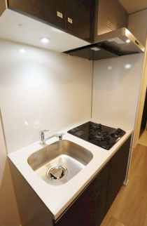 システムキッチンは2口ガスコンロを備えており、自炊派の方にも満足いただける仕様です。作業スペースがしっかり確保されているため、同時調理もしやすく、料理の効率が上がります。収納力のあるキャビネットで、調理器具や食器もすっきり整理可能です。都市ガス対応で、ランニングコストを抑えられる点も嬉しいポイントです。