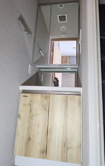 独立洗面台は、朝の身支度を快適にする重要な設備です。洗面スペースがしっかり確保されており、鏡も大きく使いやすい仕様です。収納もあるため、洗面用具やタオル類を整理しやすく、生活感を抑えた空間を保てます。来客時にも生活空間と分けて使える点は大きなメリットです。
